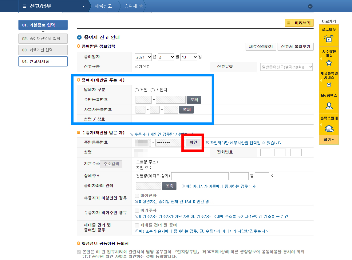 다 입력하면 증여받는 사람 정보를 입력해야겠죠?