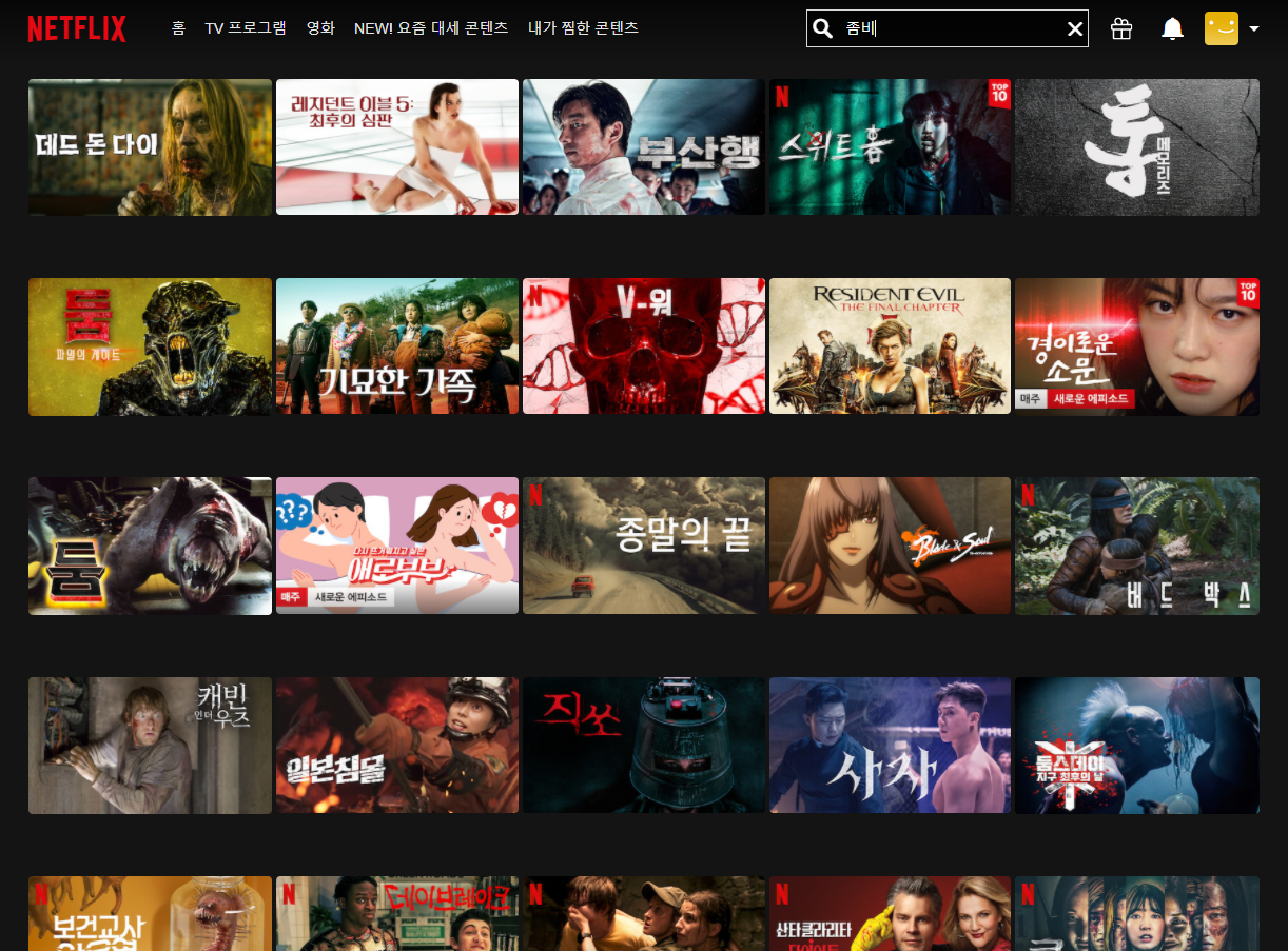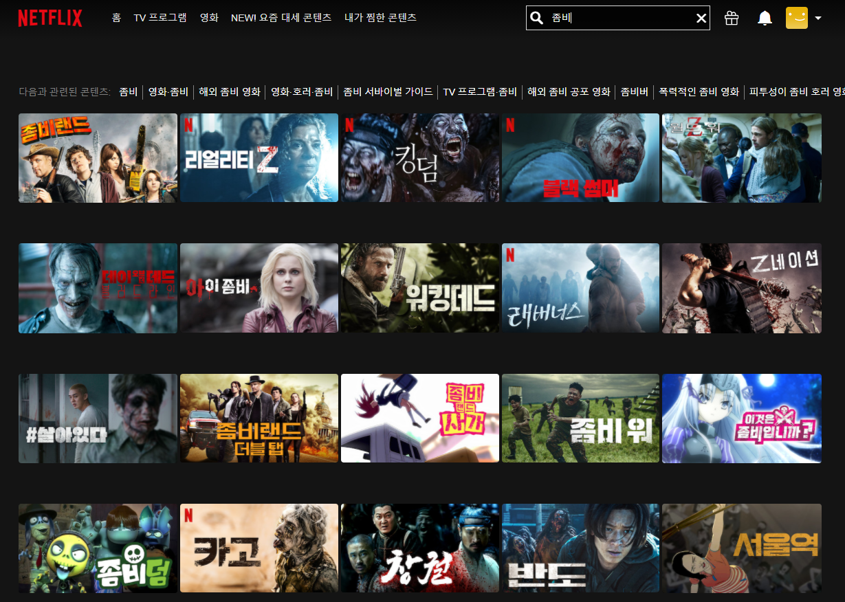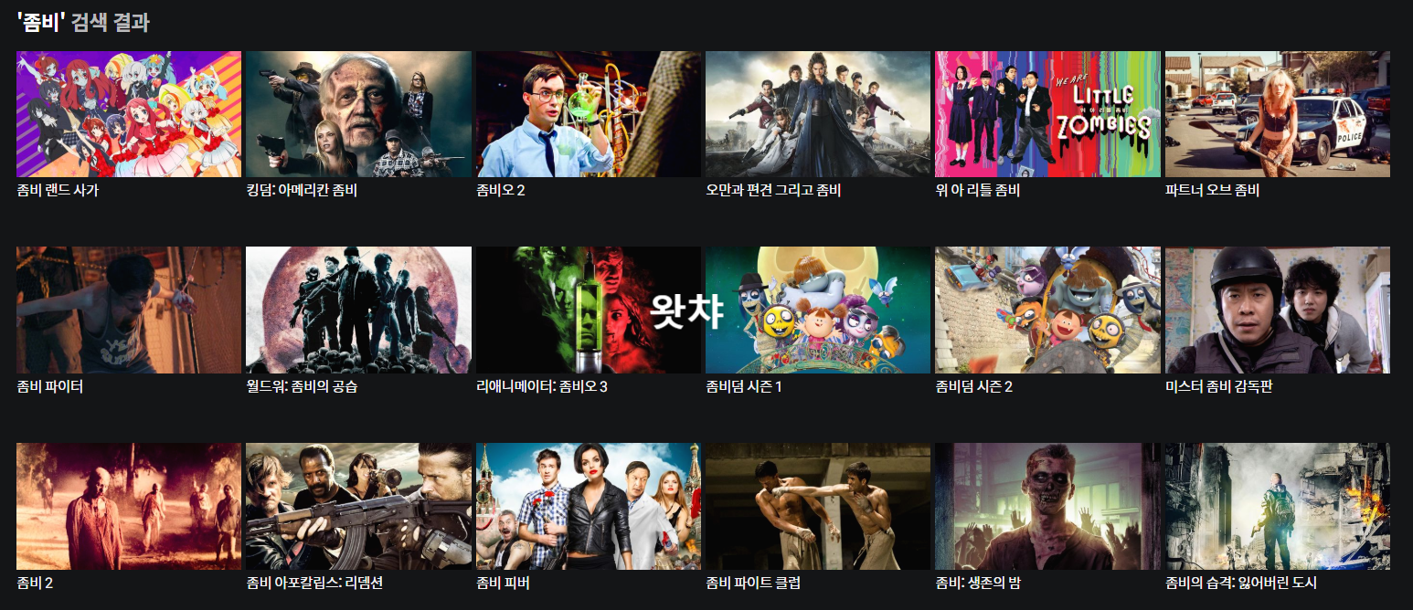 넷플릭스에서 "좀비"로 검색한 화면입니다.