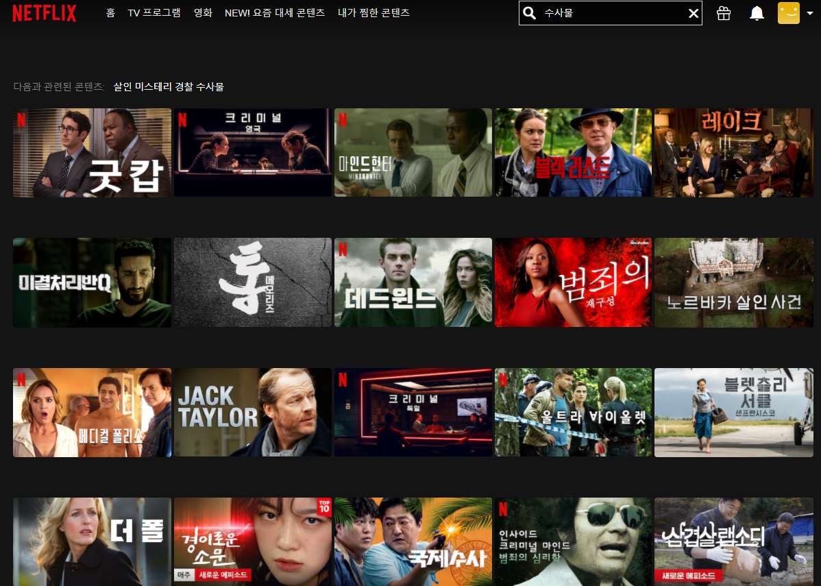 넷플릭스에서 "수사물"을 검색한 화면입니다.