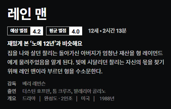 그런데 왓챠에서 「레인 맨」에 붙여놓은 특징은