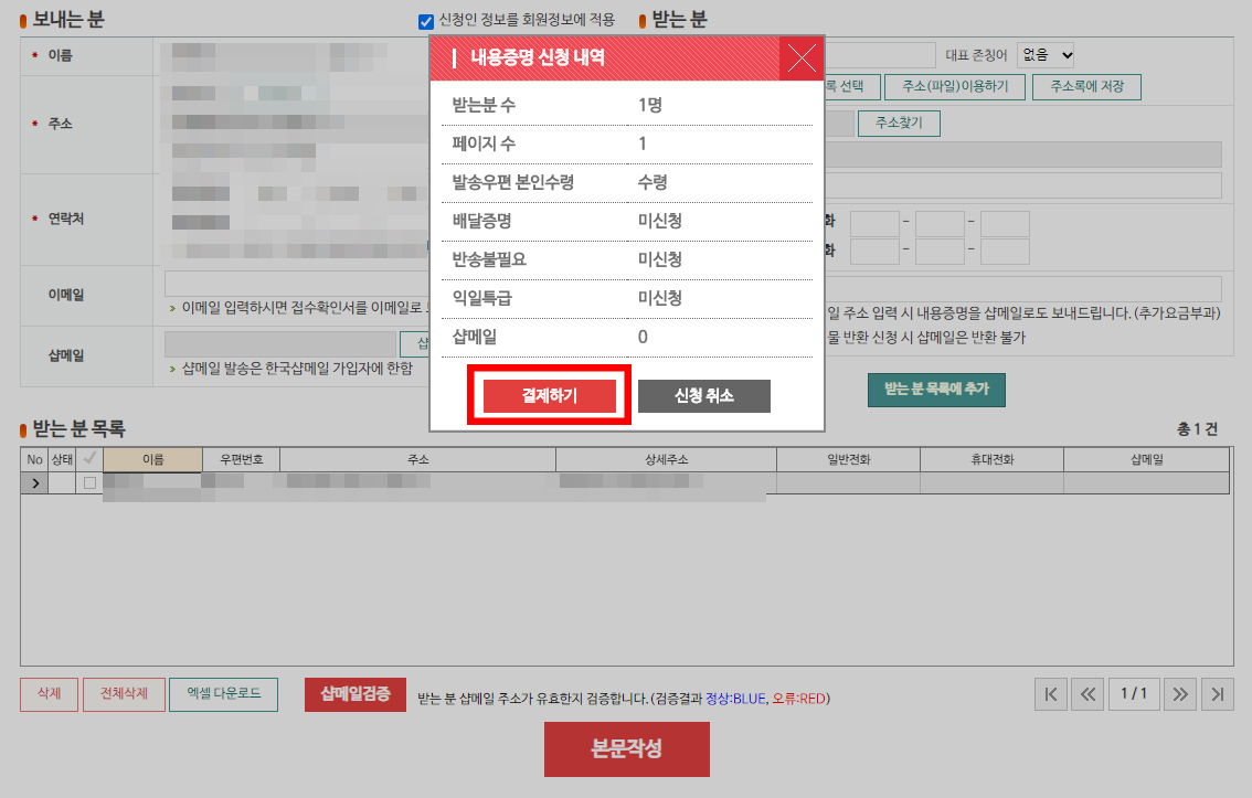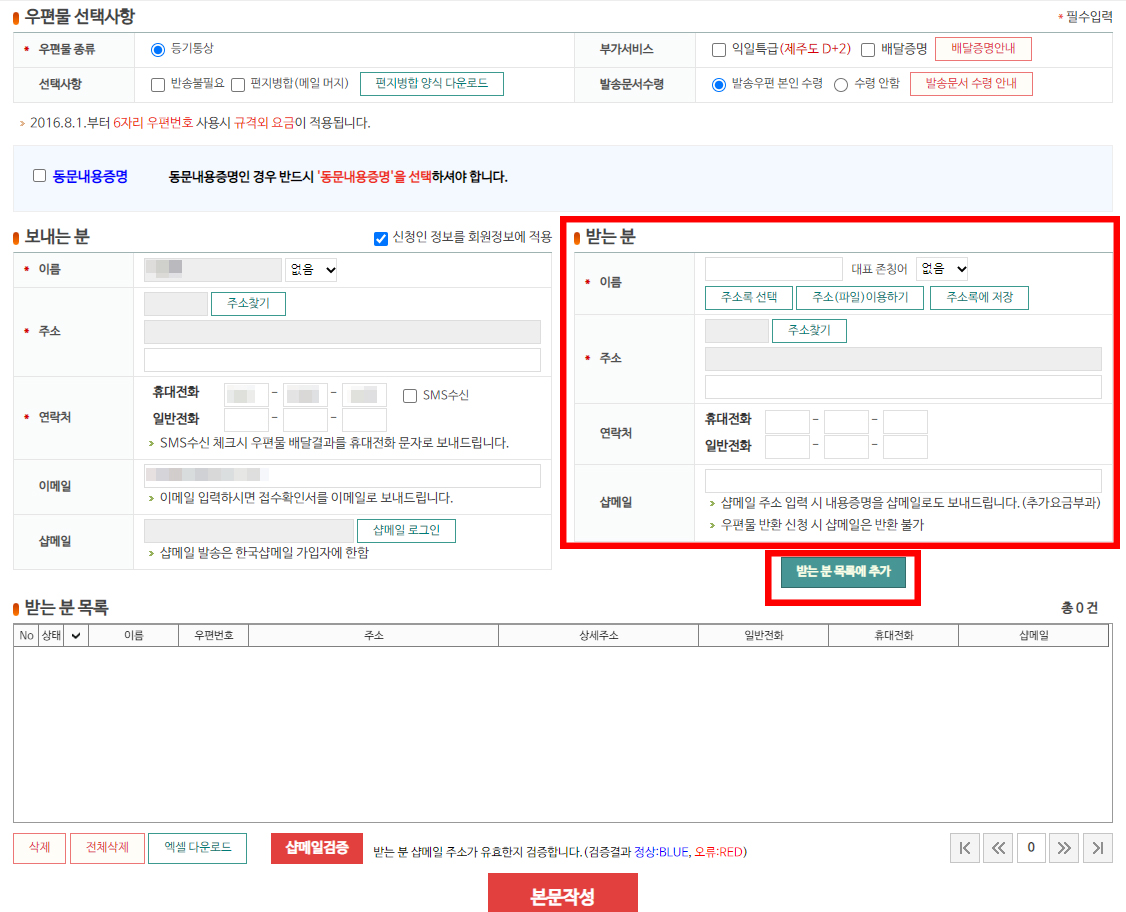 받는 분 쪽에도 이름, 주소, 연락처 쭉 채우고